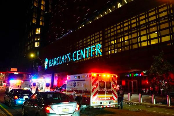 当地时间5月29日凌晨,救护车聚集在巴克莱中心外。图源:外媒