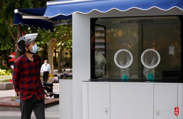 一位市民查看曹杨影城底楼新设立的常态化核酸采样站点服务信息。