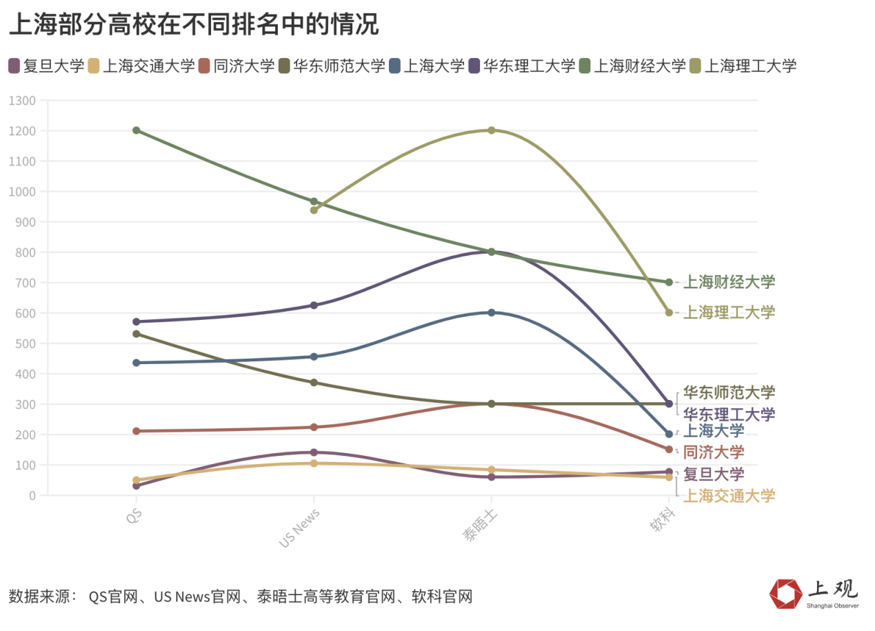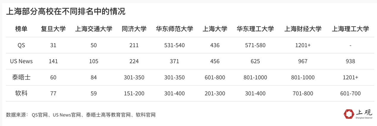 上海交通大学在软科和us news的榜单中,排名高于复旦大学,但在qs和泰晤士的榜单中,排名又低于复旦。这种情况不仅只是针对复旦大学与上海交通大学,华东师范大学与上海大学亦是如此。
