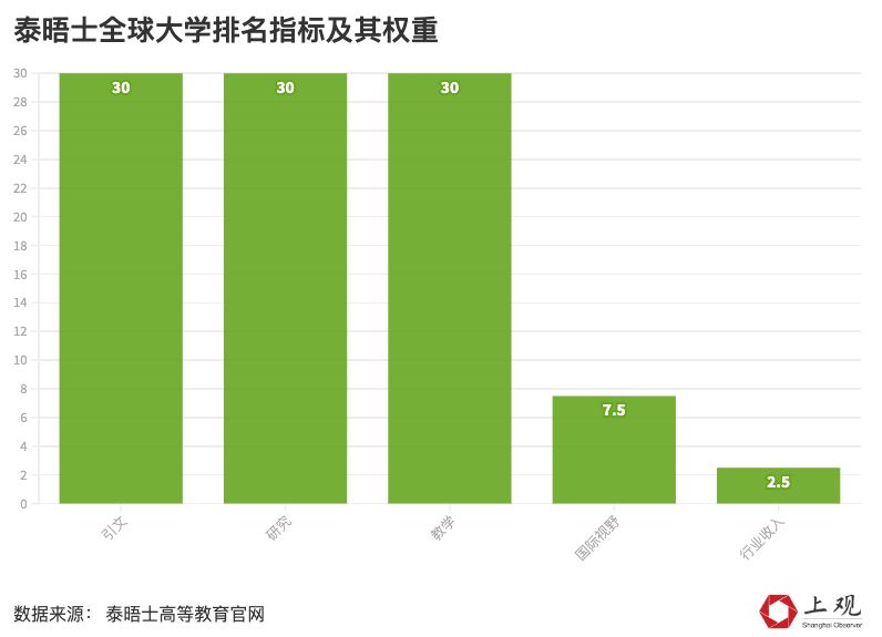 泰晤士世界大学排名的评估指标主要包括:引文(研究影响)占比30%、研究(规模、收入和声誉)占比30%、教学(学习环境)占比30%、国际视野(员工、学生、研究)占比7.5%、行业收入(知识转移)占比2.5%。