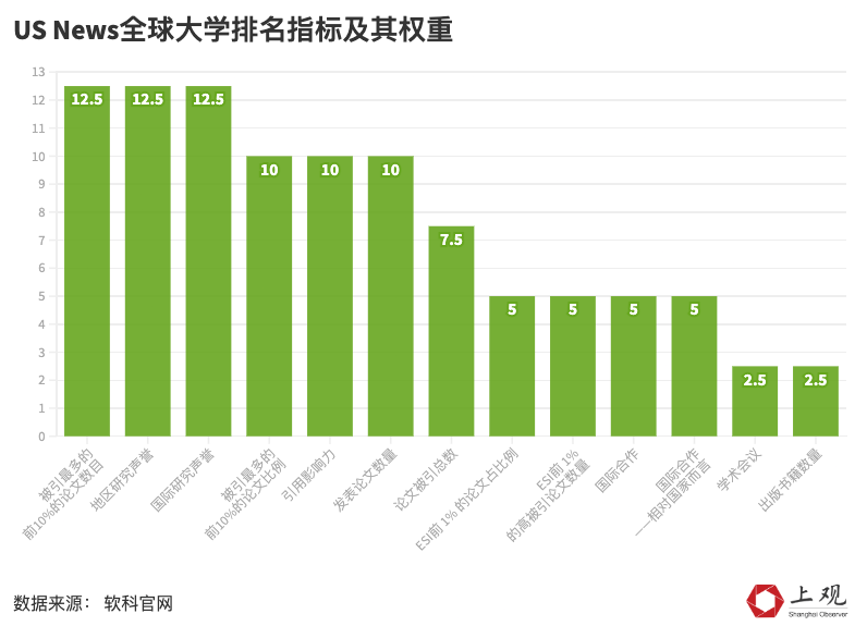 us news全球大学排名将13个指标纳入了评估当中。其中国际研究声誉、地区研究声誉以及esi前10%的被引论文数所占权重最大,均为12.5%。