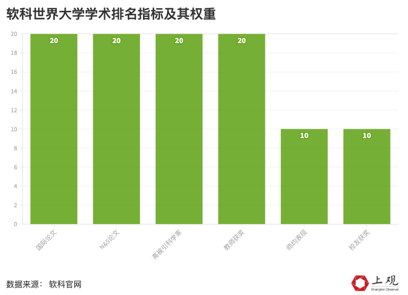 软科世界大学学术排名主要根据教育质量、教师质量、科研成果、师均表现为一级评估指标,而这些一级评估指标又细分为6个二级指标。其中国际论文、n&s(即《自然》和《科学》)论文、高被引科学家以及教师获奖数四个指标均占20%,师均表现和校友获奖则分别占10%。