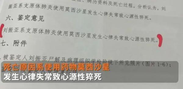 据家属提供的尸检报告显示,死者刘振亚所患支原体肺炎不足以导致其死亡,死亡原因系使用药物莫西沙星发生心律失常致心源性猝死。