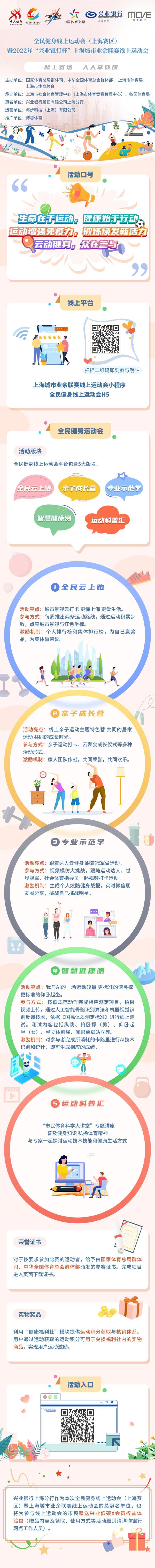 6月10日起,线上运动会各项赛事活动将陆续推出,并持续开展至11月。市民朋友可关注“上海体育”政务微信,在后台发送“全民健身线上运动会”,或点击菜单栏“体荟魔都”-“线上运动会”参与活动,亦可保存下方二维码识别后进入全民健身线上运动会h5平台报名参与。所有参赛者均可获得由国家体育总局群体司、中华全国体育总会群体部颁发的对应项目电子参赛证书。成功完赛的参与者还将获得相应积分,至福利社商城兑换精美奖品。兴业银行上海分行作为本次上海城市业余联赛线上运动会的总冠名单位,也将为参与线上运动会的上海市民赠送兴业低碳x会员权益体验包(赠品内容及领取、使用方式等活动细则请详询银行网点工作人员)。