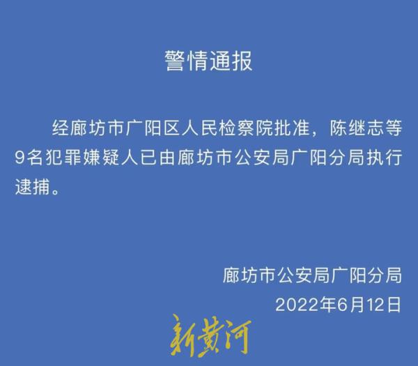 陈某志是否就是陈继志?12日上午,廊坊市公安局广阳分局发布警情通报,直接点出陈继志等9人被逮捕。