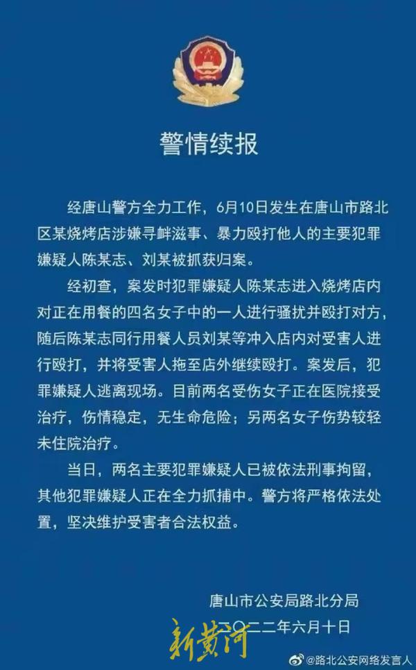 6月11日,唐山市公安局路北分局发布警情通告:经唐山警方全力工作,6月10日发生在唐山市路北区某烧烤店涉嫌寻衅滋事、暴力殴打他人的主要犯罪嫌疑人陈某志、刘某被抓获归案。