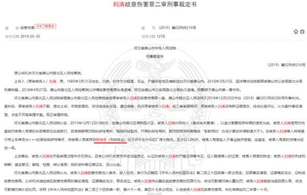 2018年12月20日,唐山市路北区人民法院,作出刑事判决,被告人刘涛犯故意伤害罪,判处有期徒刑二年零一个月。刘涛不服,提起上诉,2019年3月,河北省唐山市中级人民法院作出终审判决,驳回上诉,维持原判。