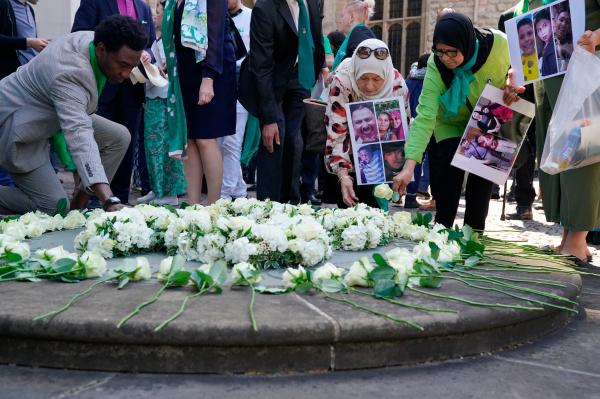 6月14日,人们在英国伦敦参加格伦费尔大楼火灾纪念日活动。位于伦敦肯辛顿区的24层高楼格伦费尔大楼2017年6月14日凌晨燃起大火,72人丧生,是近年英国死亡人数最多的火灾。