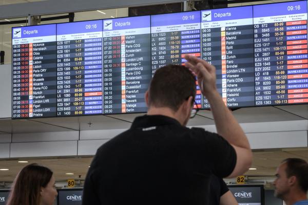 6月15日,乘客在瑞士日内瓦机场关注航班信息。