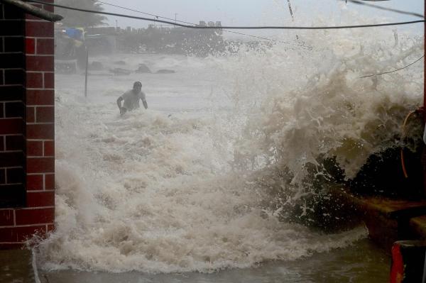 6月15日,在印度孟买,涨潮的海水涌入居民区。