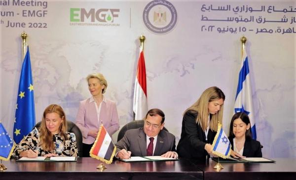 6月15日,埃及开罗,埃及石油和矿产资源部长塔里克·毛拉、以色列能源部长卡里娜·埃尔哈拉尔与欧盟能源执委卡德里·西姆森在埃及首都开罗签署天然气合作三方协议。