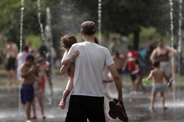 6月15日,西班牙首都马德里,当地民众在喷泉中戏水消暑。