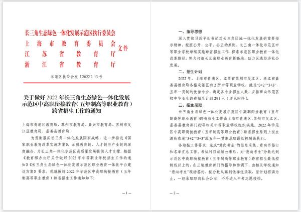 2020年以来,示范区发挥职业教育一体化发展优势,跨省域招录优秀人才。2020年,上海青浦浙江嘉善江苏吴江三地首次实现了跨省域中职招生和跨省域中高职贯通培养,三地6所学校拿出各自优势、特色专业面向示范区内进行跨省域招生。2021年,青嘉吴三地各指定辖区内2所中等职业学校,挑选专业均为“3+2”“3+3”、五年一贯制优势专业,面向一体化示范区初中毕业生跨省招生255人。