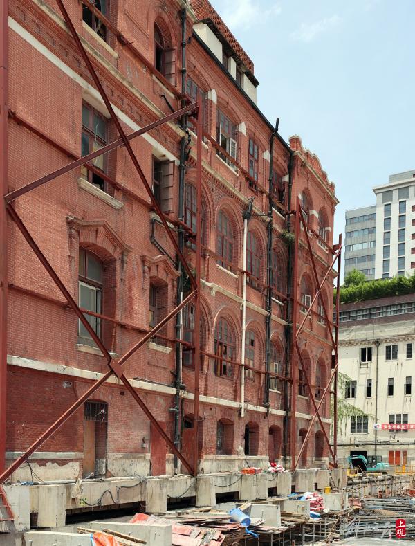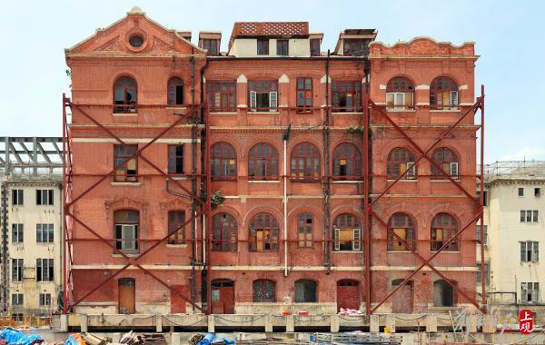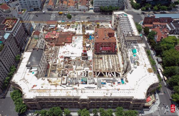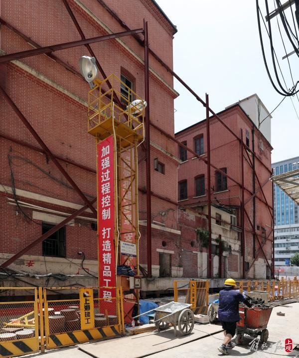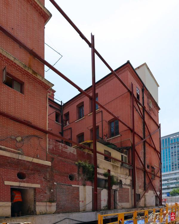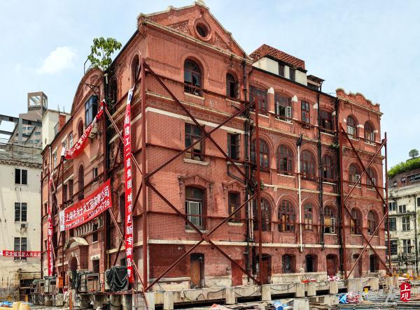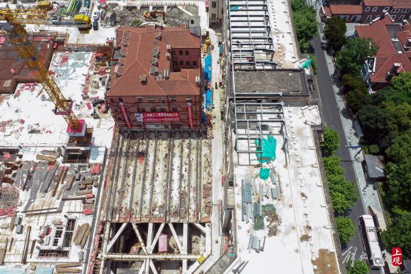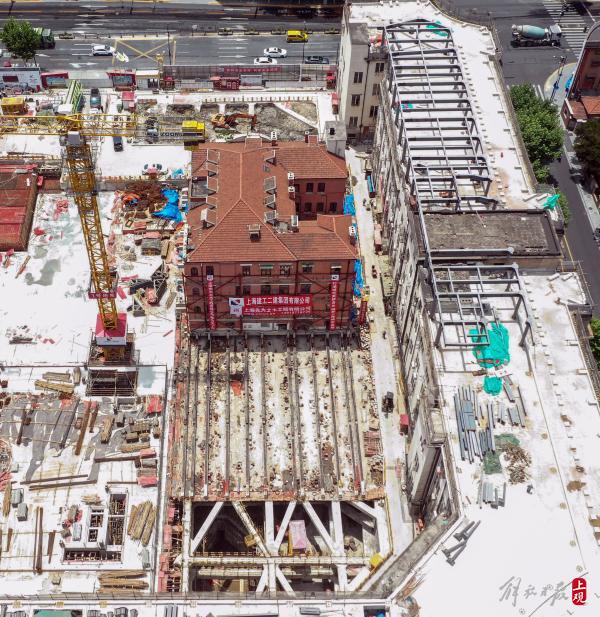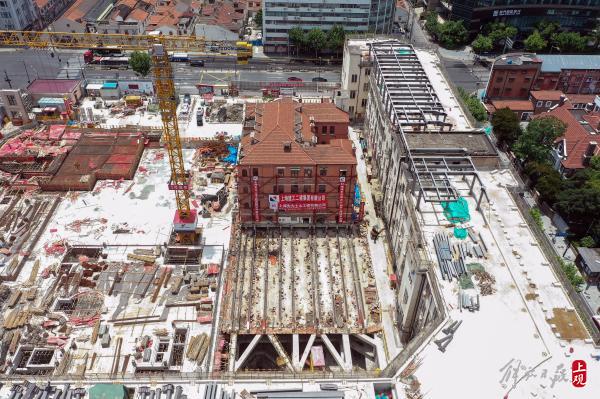 据现场施工的平移专业单位上海先为土木工程有限公司工程师介绍:“小红楼”在基坑栈桥上停留18个月后,于2022年6月30日正式启动平移回迁施工,计划本月8日正式回到原址。“小红楼”重约3800吨,是上海目前面积最大、重量最重的砌体结构平移工程,回归原位前地下工程结构也已完成改造。