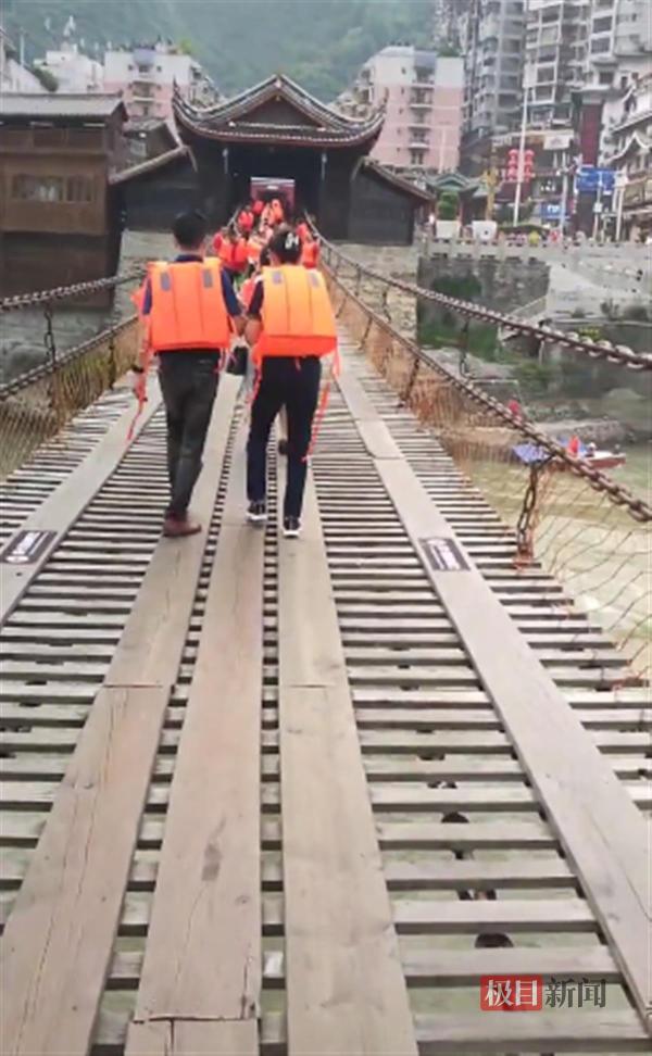 游客身穿救生衣过桥(图片来源:网络视频截图)