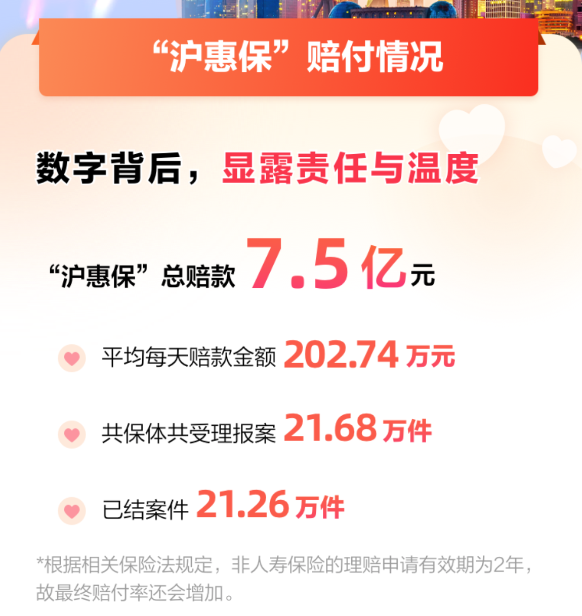 近日,政府指导的城市定制型商业补充医疗保险——“沪惠保”首年理赔报告出炉。报告显示:2021年版“沪惠保”已结案件21.26万件,总赔款额7.5亿元。