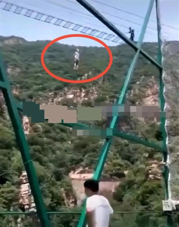 九山顶景区“步步惊心”项目中游客(红圈内)突发昏迷,救援过程中安全绳脱落导致游客高坠