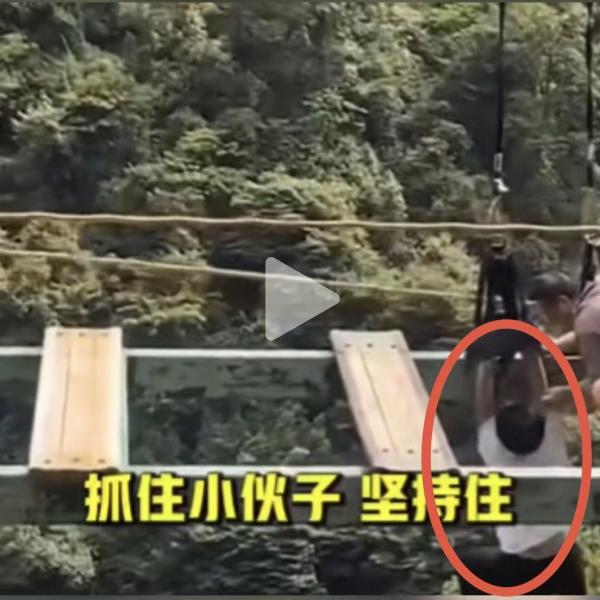 恩施地心谷景区“步步惊心”项目上10岁男孩紧紧抓住已脱离上半身的安全绳
