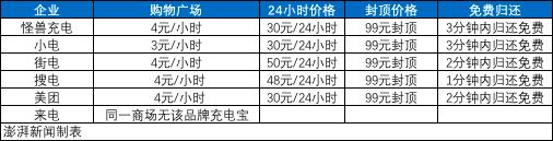 不同城市,不同区域,共享充电宝价格的收费也存在差异。澎湃新闻记者走访了上海部分市区商场、郊区沿街商铺以及旅游景点的充电宝价格发现,充电宝价格多以3-4元/小时为主,在一些热门景区,价格达到5元/小时,封顶价格均在99元。在收费规则上,有些充电宝品牌即便多使用1分钟,也按1小时收费。