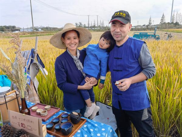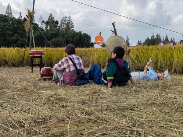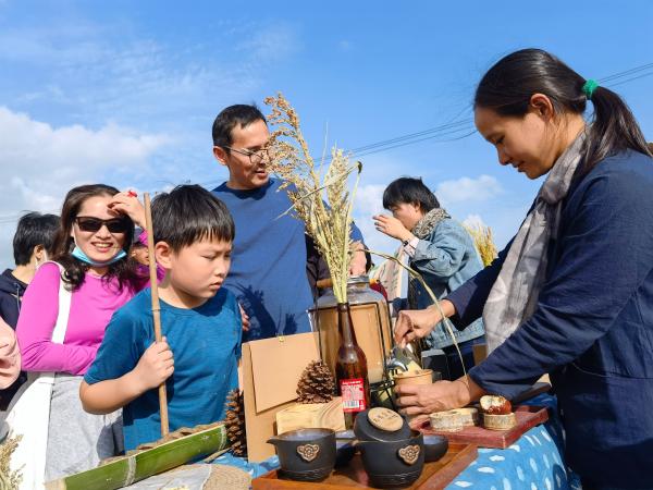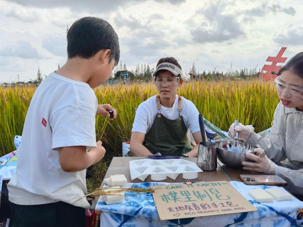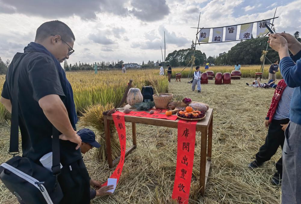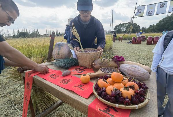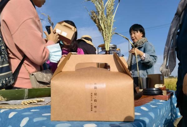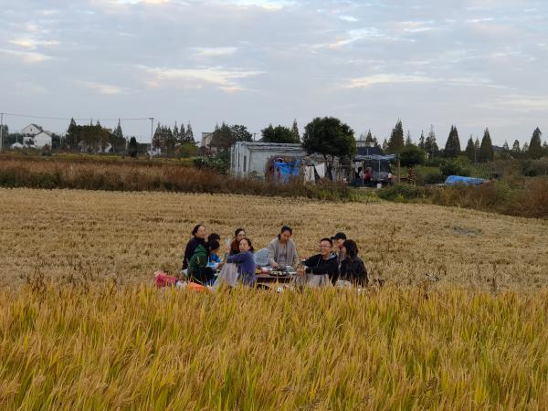 他们中,有的人正躺在散发着清香的稻草上,默默地仰望蓝天白云;有的人带着孩子正奋力割稻、脱粒,体验难得的农耕生活;有些人在摆出满桌瓜果后,以深情朗诵表达对大自然的感恩;还有些人,则在田间三三两两摆摊,展示售卖自制的有机奶茶、粗粮饼干、手工香皂等。