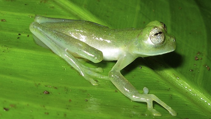 只有曲别针大小的玻璃蛙是夜行动物。它们白天栖身树叶下睡觉时,把全身绿色皮肤变成一片透明,使得自己在日光照射之下好似露珠,以便躲过蜘蛛、蛇等天敌的捕食。到了夜间,它们醒来觅食或交配,身体又要变为一种不透明的红棕色。