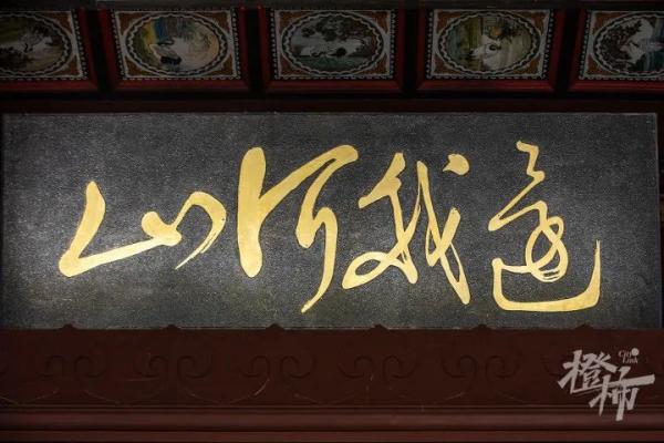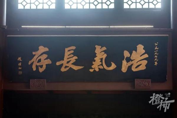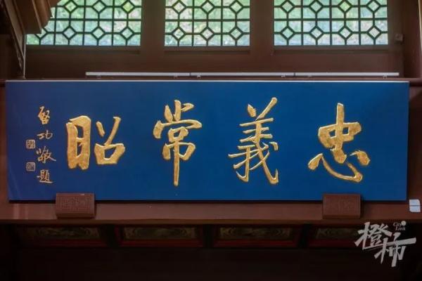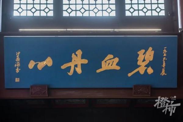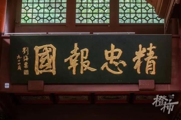 在岳王庙内,可以看到刘海粟94岁时写的“精忠报国”匾额。