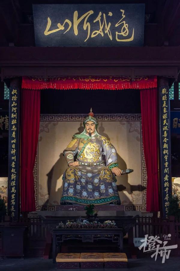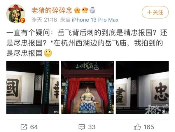 这里还有一个知识点,照墙上这四个大字是谁写的?明代书法家洪珠。仔细看会发现,这个“国”字少了一点,有人说,岳飞死后,国不成国,所以特意少写一点。其实“国”字少一点儿是古时书法家为了顾全文字结构而采取的一种常见写法。