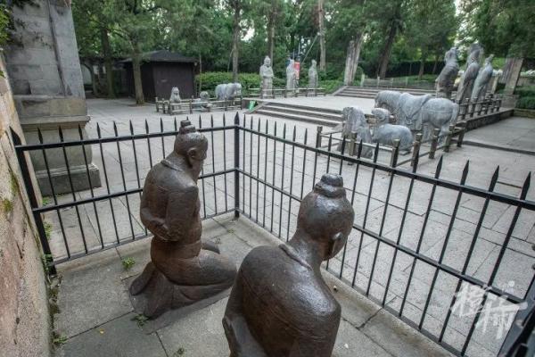 在岳王庙墓园区内,还有一组铁跪像,赤裸上身,两手反绑,双膝跪地,作俯首就刑状。这就是当年诬陷、残害岳飞父子的四奸:秦桧、王氏、万俟卨(mò qí xiè)(万在这里读mò,“万俟”是复姓,本为鲜卑部落名,后魏以为姓氏)和张俊。