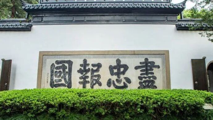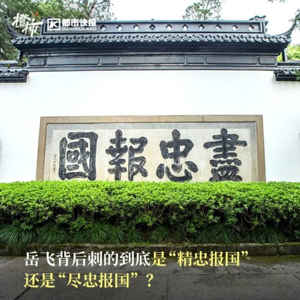 在岳庙陵园甬道尽头的照壁上,刻着“尽忠报国”四个苍劲有力的大字。看到这里,很多人都有一个疑问:岳飞背后刺的到底是“精忠报国”,还是“尽忠报国”?