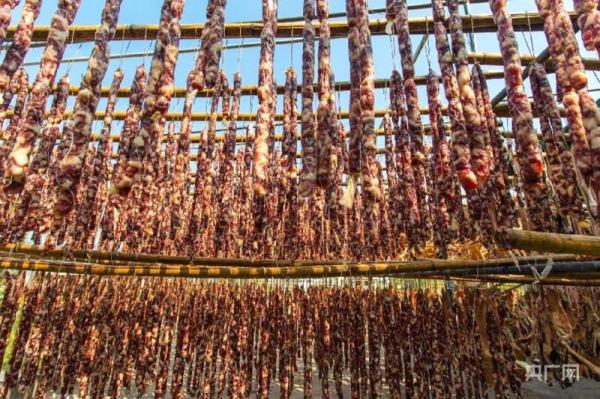 “连州地下河方向吹来的河风,再加上特殊的地理条件,在这里形成一个‘漩涡’,让东陂成了一个天然的腊肉风干场。”站在自家挂满腊肠的顶楼平台上,清远市乡村振兴新闻官朱敏艳在直播中热情地推介着家乡特产。