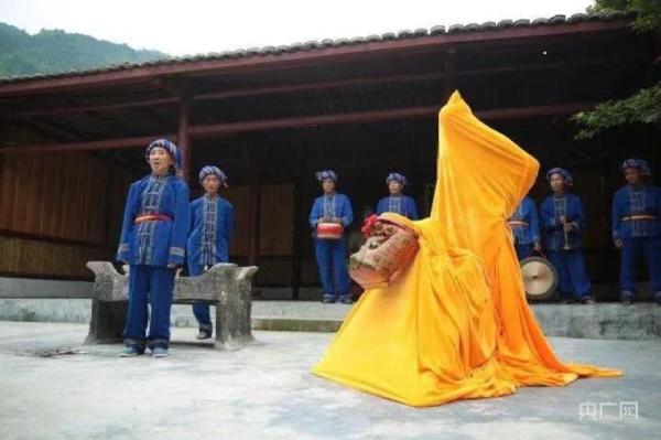 连州市三水乡挂榜村木狮队在表演瑶族布袋木狮舞(央广网发 连州市委宣传部供图)