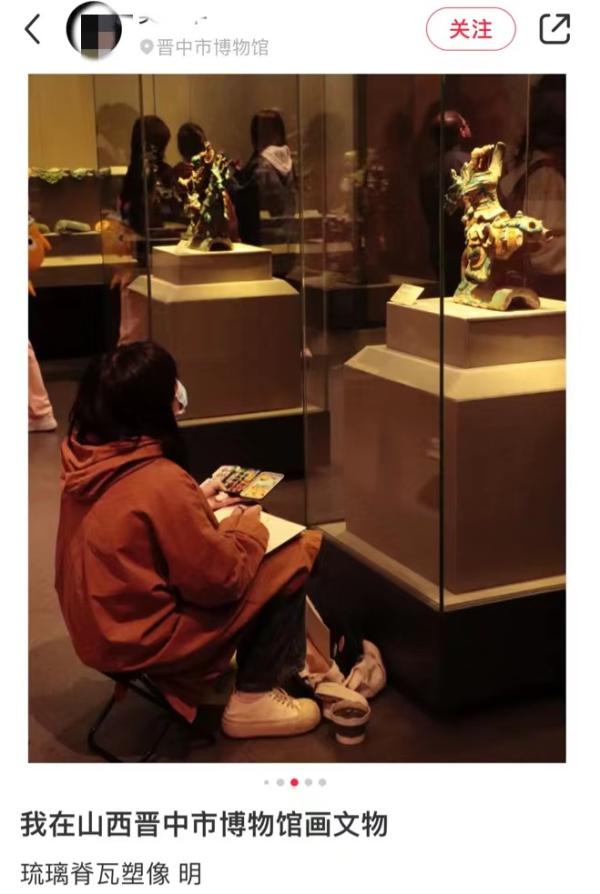 日前,有网友在社交平台上发布了自己在山西晋中市博物馆现场临摹文物的消息。在该网友发布的照片中,她坐在展陈琉璃脊瓦塑像的玻璃柜前,双膝顶住画本,一手执笔,一手拿调色板,脚边是装水的杯子,包袋则顶住了陈列柜。在另一张照片中,还有保安和参观者在围观。据其自称,当天写生过程大约两小时,并表示今后打算一直更新水彩绘画山西文物。