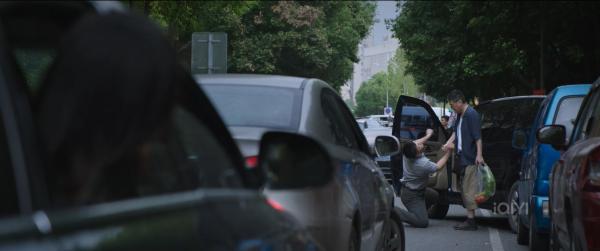 伴随着轻松小调,一个老头背心配敞开衬衫,深蓝色袜子配拖鞋,一手拎菜,一手拿粉蓝配色水壶的佝偻背影出场,卫峥嵘笑眯眯地劝乱停车的驾驶员挪车。对方出言不逊,他叼起水壶腾出一只手,握住对方一发力,驾驶员连连告饶。