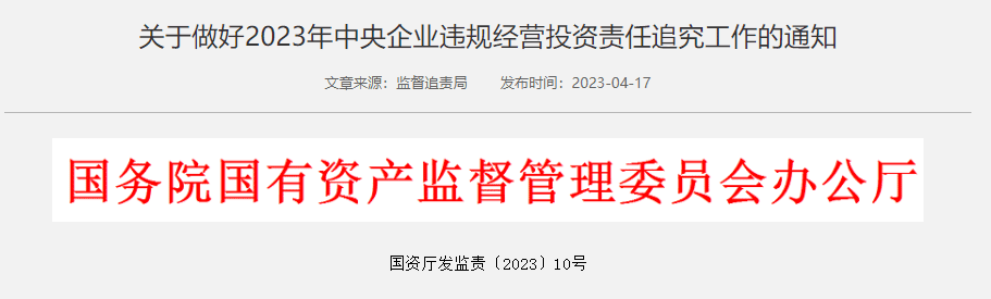 4月17日,国资委监督追责局发布《关于做好2023年中央企业违规经营投资责任追究工作的通知》(简称“通知”)。