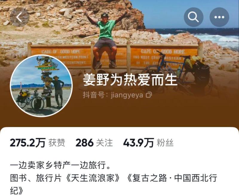 据悉,姜野是一位职业旅行者,六年独自骑行5万多公里,走过三大洲三十余个国家,被称为“天生流浪家”。他以视频的方式将旅行见闻和当地的风俗民情记录下来,在全网各个视频平台与受众分享,还曾自制30集旅行片,出版发行一部24万字的游记。