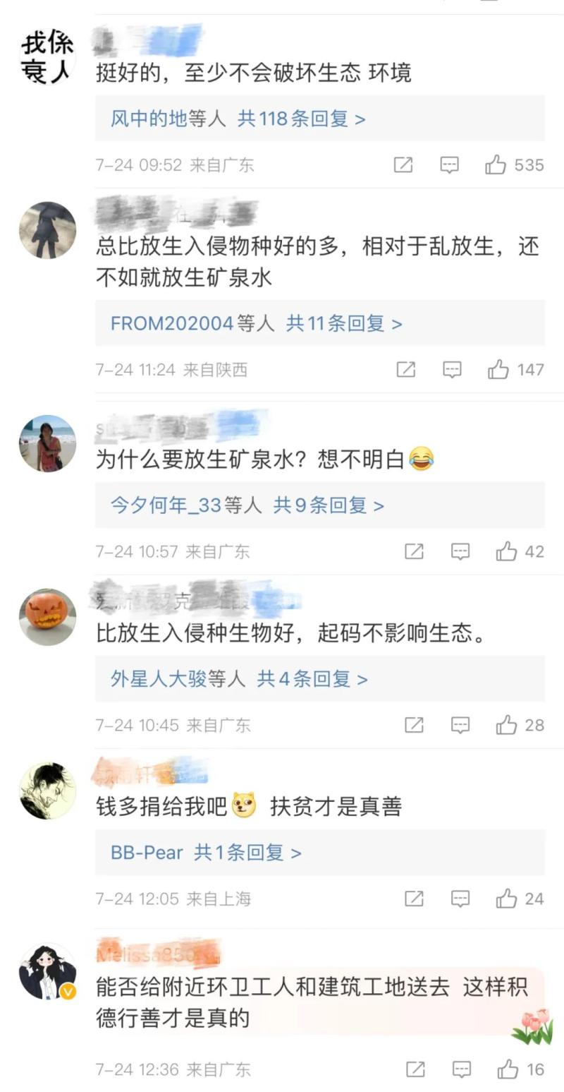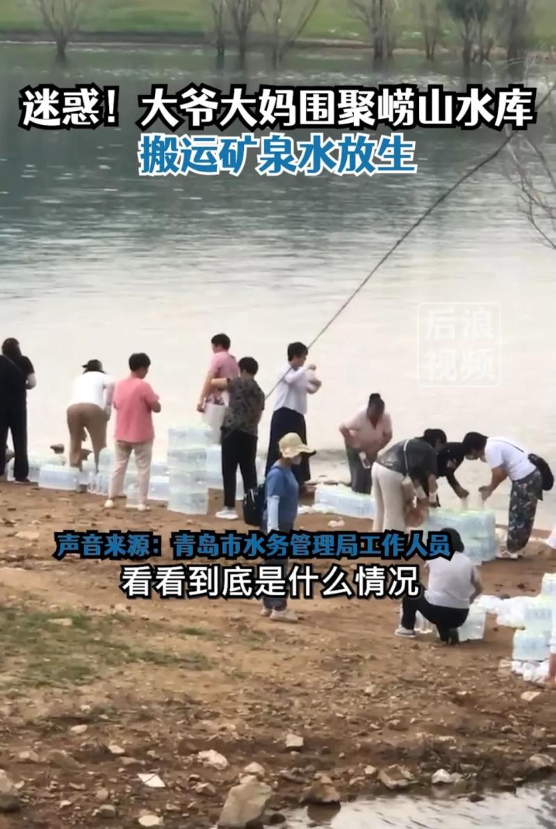 有网友称不理解这种行为吃饱了撑的,有网友表示放生矿泉水是愚昧的行为。7月24日,青岛市水务管理局工作人员表示,这种行为不妥会去调查处理此事。