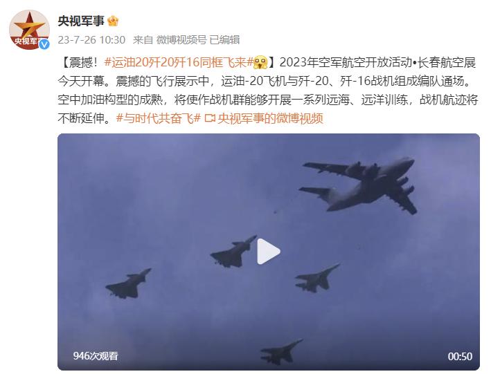震撼的飞行展示中,运油-20飞机与歼-20、歼-16战机组成编队通场。空中加油构型的成熟,将使作战机群能够开展一系列远海、远洋训练,战机航迹将不断延伸。