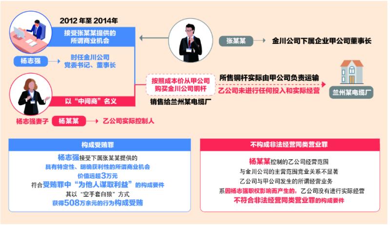 首先是2012年至2014年,杨志强利用担任金川公司党委书记、董事长的职务便利,接受金川公司下属企业甲公司董事长张某某(另案处理)提供的所谓商业机会,违反金川公司有关产品销售的规定,通过其妻杨某某控制的乙公司,以“中间商”名义按照成本价从甲公司购买金川公司铜杆后销售给兰州某电缆厂,所售铜杆实际由甲公司直接送至兰州某电缆厂,乙公司未进行实际经营活动,杨志强夫妇从中获利508万余元。