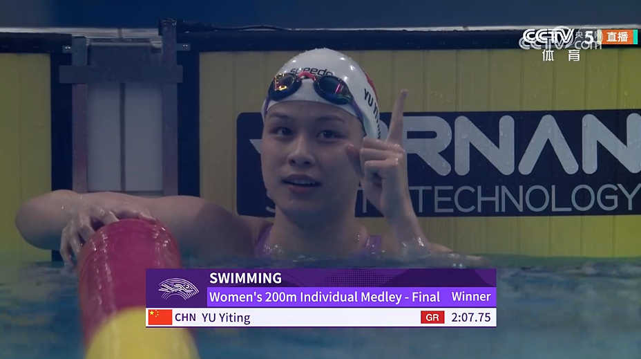 在游泳女子200米个人混合泳决赛,中国选手余依婷以2分07秒75的成绩斩获金牌,并打破2分08秒34的赛会纪录,刷新个人最好成绩。叶诗文获得银牌。