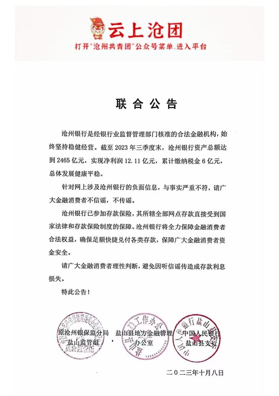10月9日,“沧州共青团”公众号发布一份署名为原沧州银保监分局盐山监管组、盐山县地方金融管理办公室、中国人民银行盐山县支行的联合公告,为近期网络流传的和沧州银行有关的不实信息进行公开辟谣。