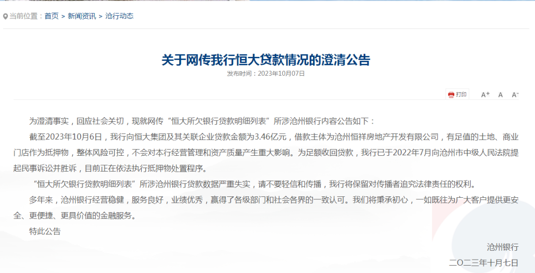 早在10月7日,沧州银行在其官网发布澄清公告称,“恒大所欠银行贷款明细列表”所涉沧州银行贷款数据严重失实,请不要轻信和传播,沧州银行将保留对传播者追究法律责任的权利。
