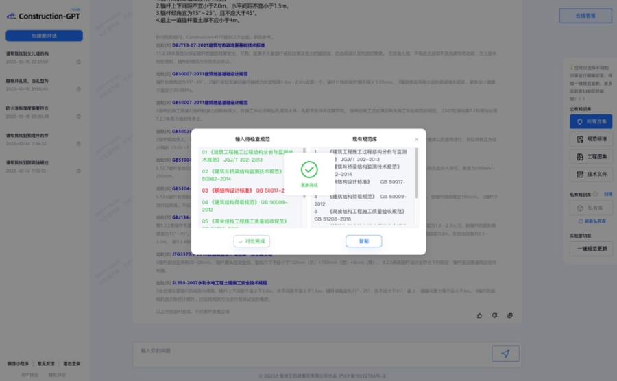 研发团队利用自主研发的建筑专业词嵌入模型、半监督微调、大模型价值对齐3项关键技术,实现了5000多本规范标准、1000多份工程图集、150多份企业内部技术文件的智能解析,技术人员通过对话问答方式,就能快速全面了解最新规范标准、工程图集、内部技术文件中的详细规定和要求。
