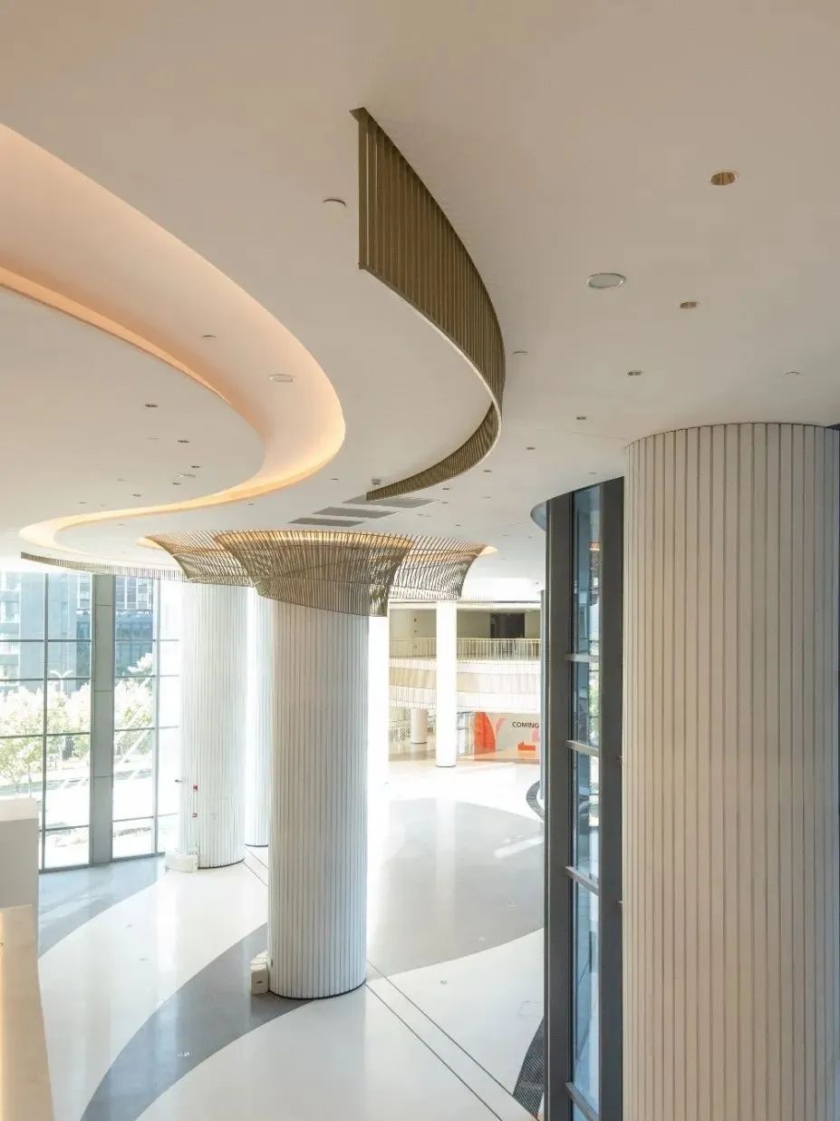 转身绕到演艺中心背后,是设计去繁存简、返璞归真的飘带廊,专注通透感的运用,不同的渐变、不同的颜色搭配、太阳的光影效果,搭配灵动飘逸造型,别出心裁。