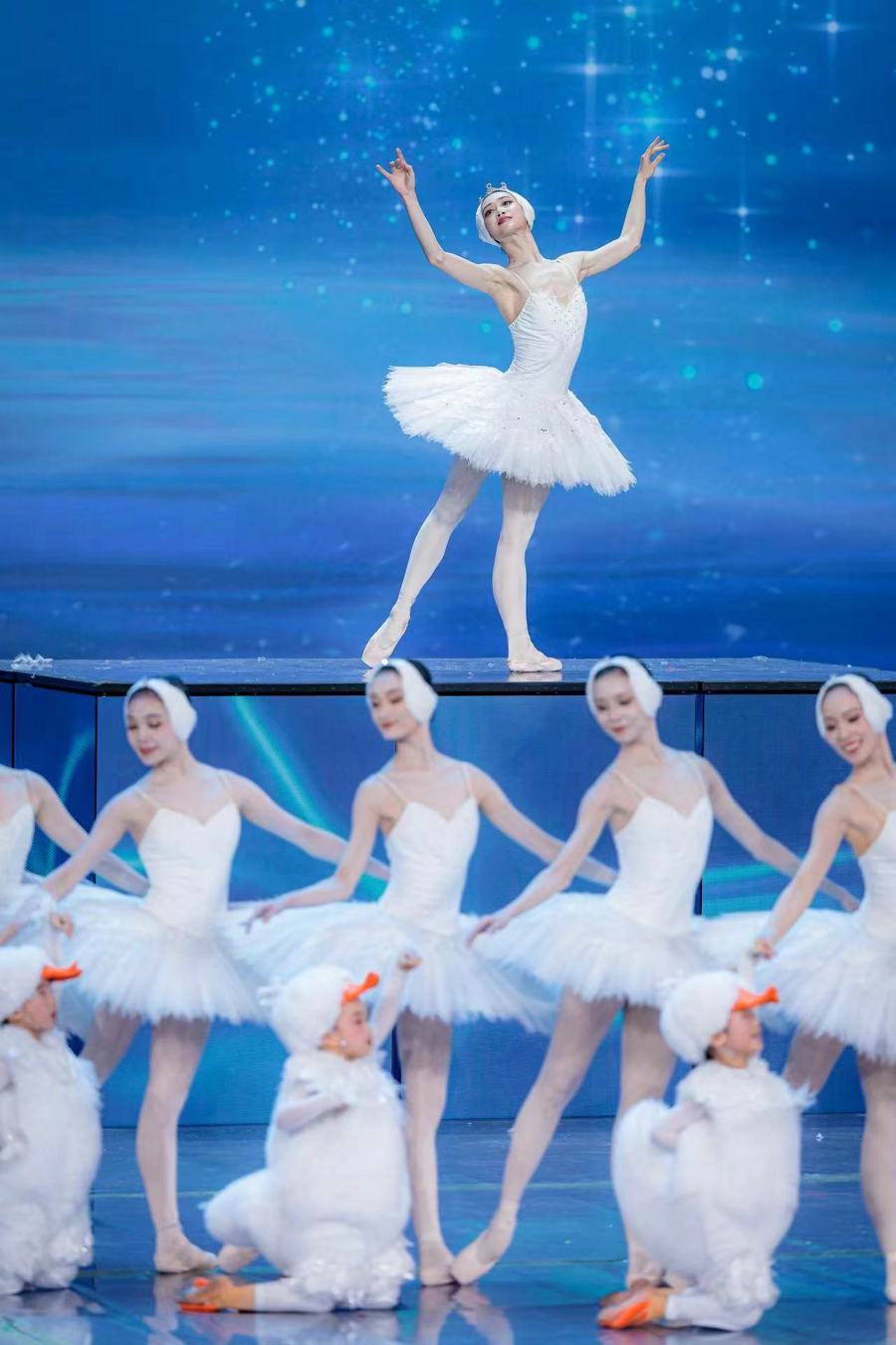 《鹅鹅鹅》讲述了一个“丑小鸭变成白天鹅”的故事。扮演“白天鹅”的戚冰雪身穿洁白的tutu裙,头戴白色头饰,用轻盈飘逸的舞姿牢牢吸引着观众的视线。