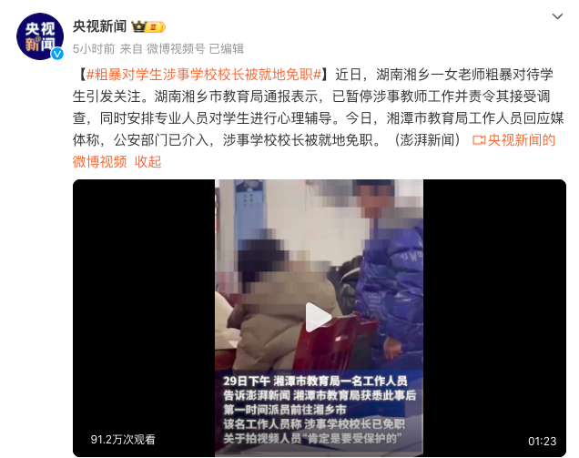 2月28日深夜,湖南湘乡市教育局通报:已暂停涉事教师工作并责令其接受调查,同时安排专业人员对学生进行心理辅导。