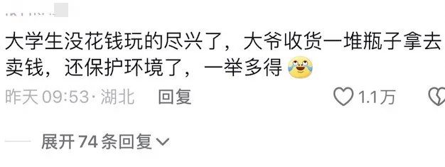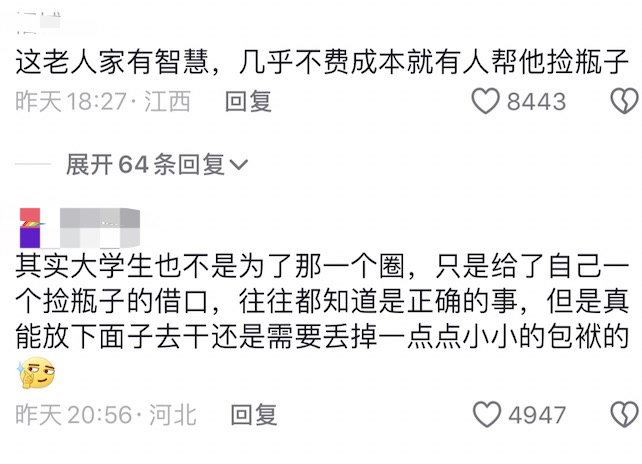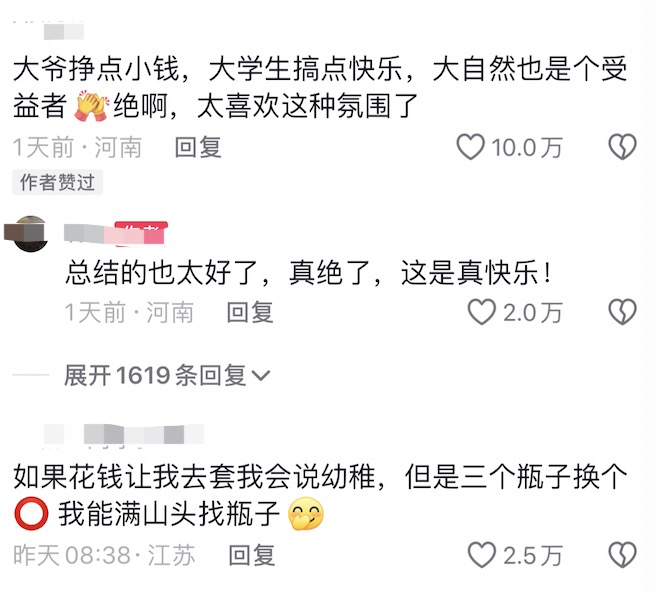 网友拍摄下这名大爷摆摊套圈的视频,并配文“一个圈五毛,可以用三个矿泉水瓶换。大学生们捡干净了山顶的瓶子,也只套走了大爷一个红绳手环”。网友们纷纷在视频下留言,“大爷挣点小钱,大学生搞点快乐,大自然也是受益者。”“又环保又快乐,这个氛围太好了。”