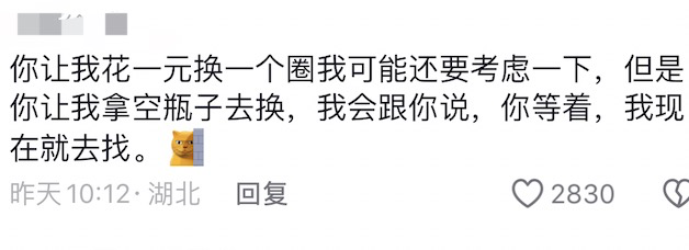 视频中,大爷穿着一身黑色工装,手中拿着一根长杆,不少年轻人围在套圈的栏杆外,往里面扔着废弃的饮料瓶。三个瓶子就能够换一个圈,而每当有人套中奖品,周围就会爆发出喝彩声和掌声。