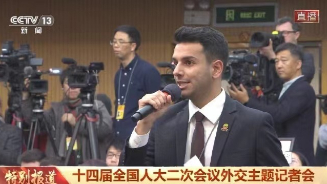 3月7日上午,十四届全国人大二次会议在梅地亚中心新闻发布厅举行记者会。发布会最后,来自迪拜的中阿卫视记者方浩明,用一口流利的中文向王毅外长提问。