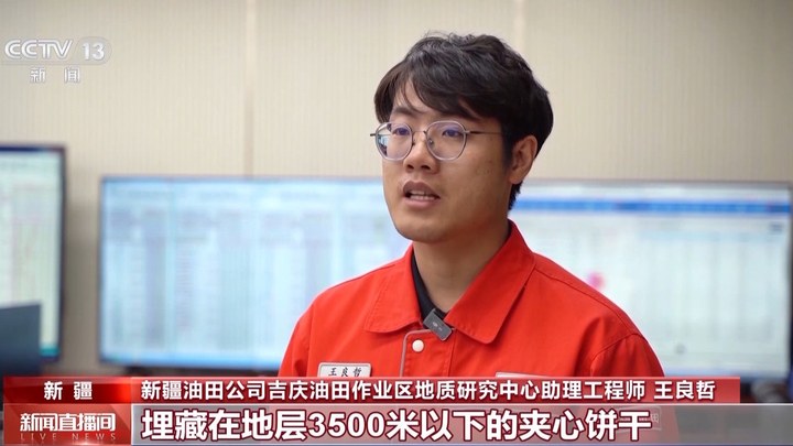 新疆油田公司吉庆油田作业区地质研究中心助理工程师 王良哲:页岩油储层就像埋藏在地层3500米以下的夹心饼干,优质储层就像夹心饼干当中的奶油层,在钻井的过程中需要控制钻具横向沿着我们的奶油层去穿行,更多与奶油层接触,这样钻出的油井后期才能获得高产,这也被称为“黄金靶体”综合识别体系,在技术突破以后,“黄金靶体”钻油率由原先的44%提高至目前的85%。