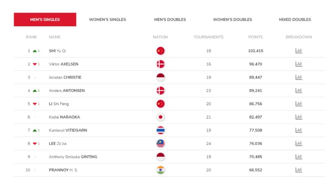 6月初,石宇奇击败队友李诗沣,获得新加坡公开赛冠军,同时赢得11000个积分,距离世界排名第一的安赛龙只差3055分。上周,安赛龙宣布退出2024年印尼羽毛球公开赛,石宇奇也提前锁定了世界第一的位置。